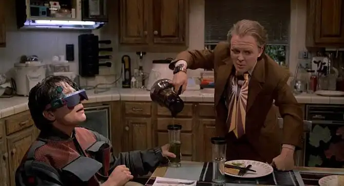 Можно припомнить и про еще один аналог Google Glass на глазах Марти МакФлая-младшего за столом: по всей видимости, это была часть домашней интегрированной системы, поскольку на подобные очки виртуальной или дополненной реальности (в фильме эта тема была не раскрыта до конца) поступал телефонный звонок, как и на все другие аппараты в доме, в том числе телефоны-факсы и телевизоры. Которых, кстати, было довольно много. С полностью голосовым управлением.