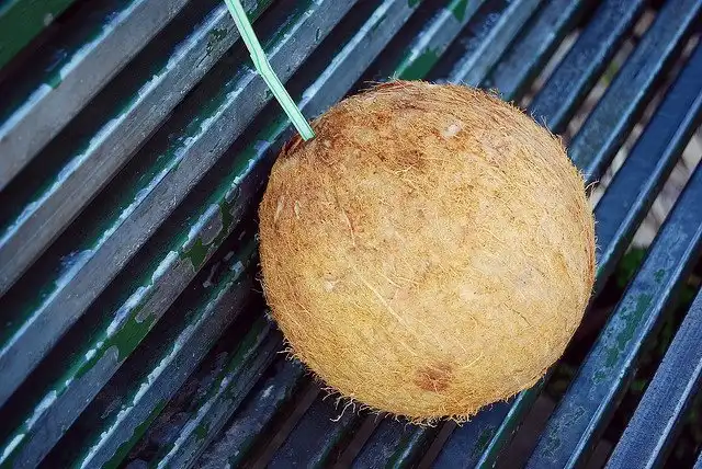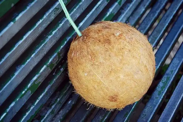 С помощью первого, что попадется под руку, делаем две дырочки в кокосовом орехе.