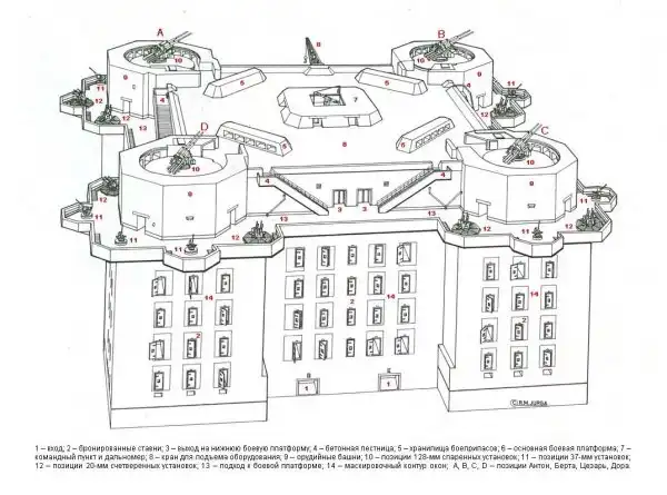 •с помощью легких зенитных орудий-автоматов обеспечивать защиту самой башни от низколетящих целей (штурмовиков);