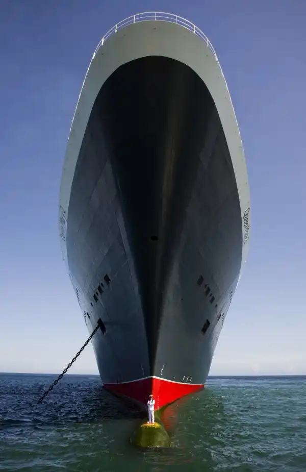 Корабль Queen Mary-2 является крупнейшим океанским лайнером в мире, его капитан в честь 10-летия судна представил свежий взгляд на его размеры и величественность. Капитан Кевин Опри позировал для снимка на выступающей из воды «бульбе» гигантского корабля весом в 151 200 тонн.