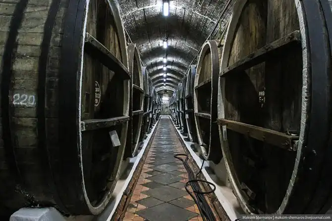 Здесь в течение года при температуре 12°C в дубовых бочках и бутах выдерживается вино.