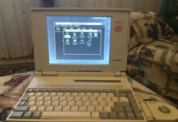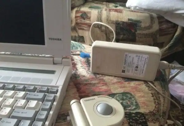 От автор: Разбираясь в гараже, наткнулся вот на такой экземпляр. Принёс домой, а он ещё и работает. В комплекте сам ноутбук, мышь (трекбол вроде называется) и зарядка.