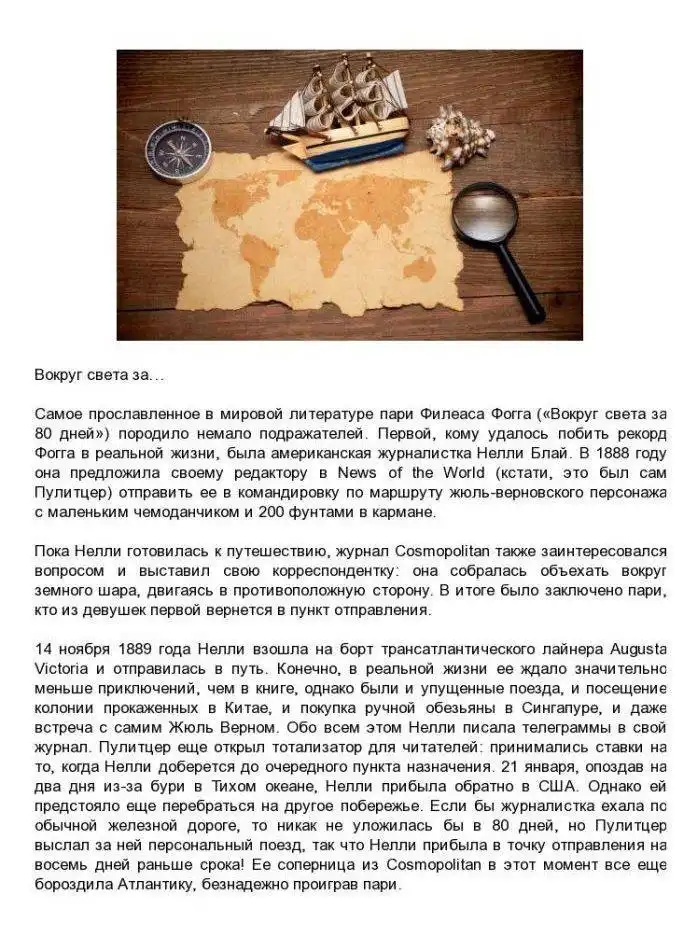 После публикации репортажа о кошмарах психиатрической больницы, Нелли Блай обрела известность. Ее стали называть Леди Сенсация. Однажды она предложила главному редактору совершить кругосветное путешествие и превзойти рекорд героя книги Жюля Верна. В одном из номеров “Нью-Йорк Уорлд” появилась заметка о том, что знаменитая Нелли Блай бросает вызов Филеасу Фоггу и готова обогнуть земной шар менее чем за восемьдесят дней.