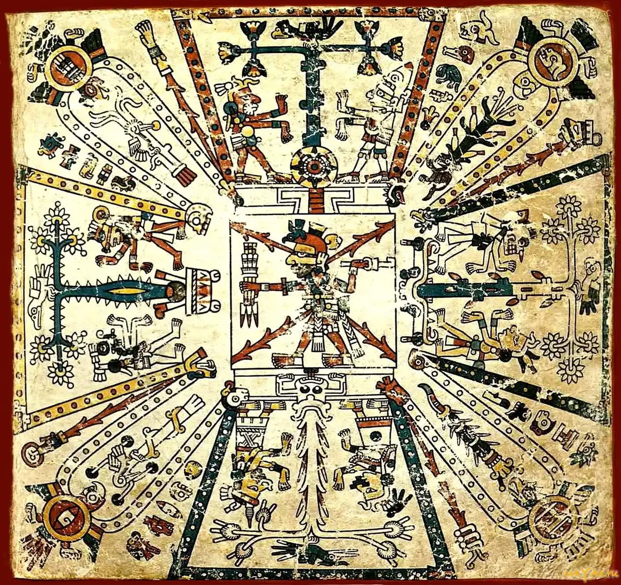 В «Кодексе Риос» рассказано о сотворении мира и о гибели первых людей. Остались дети, которых вскормило чудесное дерево. Образовалась новая раса людей. Но через 40 лет боги обрушили на землю потоп. Уцелела одна пара, спрятавшаяся на дереве.