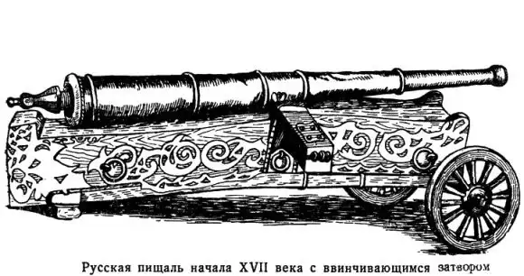 Так, например, идея заряжания «с казны», а также устройства нарезных орудий впервые появилась в России, задолго до ее возникновения на Западе. Уже в 1615 году неизвестным мастером была построена бронзовая пищаль, имевшая клиновой затвор, по идее близкий к современным конструкциям. Эта пищаль, сохранившаяся поныне, имеет 10 спиральных нарезов в канале ствола и заряжается с казенной части. Самый древний из подобных экземпляров, известных в Западной Европе, относится к концу XVII века, — стало быть, русская техническая мысль опередила заграничную по крайней мере на пол столетия.