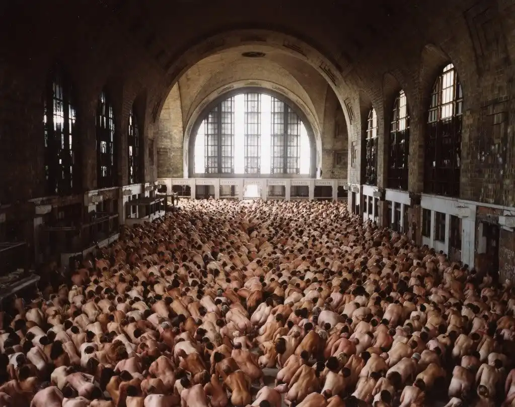 Это фото поставило меня в тупик. Есть такой фотограф, Спенсер Туник, занимается фотографированием обнаженных людей в самых необычных местах. Эти голые люди выступают добровольцами для таких фотоинсталляций и флешмобов.