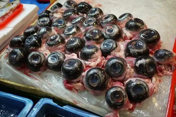 На вид это блюдо смотрится не очень аппетитно. Это блюдо состоит из полностью нетронутых глазных яблок тунца и это блюдо, безусловно, не для людей со слабым желудком. Вы можете найти Глаза тунца легко в любом продуктовом магазине в Китае или Японии.