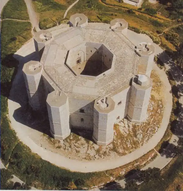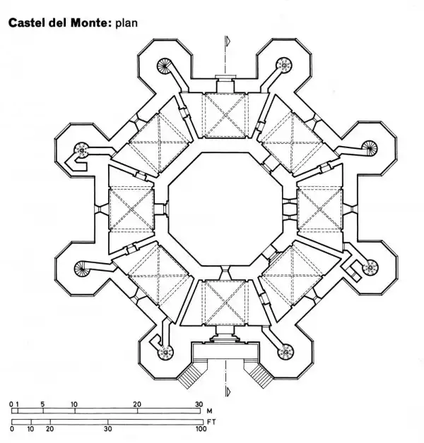 За основу двухэтажного строения Кастель-дель-Монте была взята совершенно нестандартная форма правильного восьмиугольника, благодаря которой замок и остается единственным фортификационным сооружением с такой необычной планировкой. Причем среди всех средневековых замков Западной Европы. Что, собственно, затрудняет, а нередко и ставит в тупик современных исследователей, занятых поиском достоверных аналогов, которые в XIII веке могли бы вдохновить Фридриха II на строительство столь необычного для своей эпохи сооружения. Но зная о хорошем знакомстве императора с менталитетом восточных людей (особенно сарацинов), его терпимости к чужим культурам и религиям и о его крайнем свободомыслии, можно предположить, что прообразы будущего Кастель-дель-Монте могли быть позаимствованы Фридрихом II из мусульманского мира, во время его Крестового похода на Святую землю.