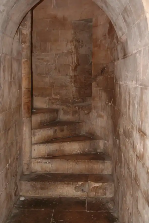 Это обеспечивает защитникам замков более выгодное положение, так как атакующим солдатам приходится подниматься по лестнице и при этом вести бой в неудобной позиции. А дело все в том, что солдаты, идущие на штурм замка, лишаются возможности наносить наиболее сильные удары своим основным оружием ― мечами, ведь для этого требуется размахнуться справа налево, в то время как солдаты, защищающие замок, благодаря закрученности лестницы и более высокому на ней положению будут постоянно находиться несколько правее. Так что нестандартное (против часовой стрелки) направление винтовых лестниц Кастель-дель-Монте получило бы хоть какое-то оправдание, только если бы замок осаждали войска, состоящие исключительно из левшей. Или, что более очевидно, Фридрих II таким способом лишний раз подчеркнул необоронное предназначение замка.