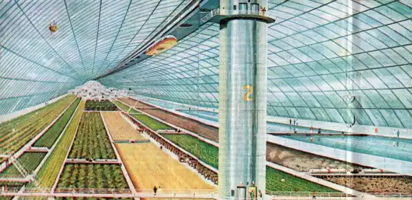 1975 год. Вид изнутри колонии, идея концепта которой принадлежит Онилу. Сельскохозяйственные сектора с различными видами овощей и растений располагаются на террасах, которые устанавливаются на каждый уровень колонии. Свет для урожая обеспечивают зеркала, отражающие солнечные лучи.