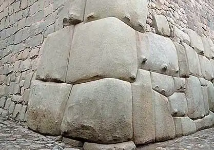 Фрагмент постройки дворца Инка в городе Куско. На данной фотографии видны такие же точкообразные выступы как и на блоках на террасах города Ольянтайтамбо. Данные остатки великанских стен были дополнены кладкой мелких булыжников современных перуанских строителей.