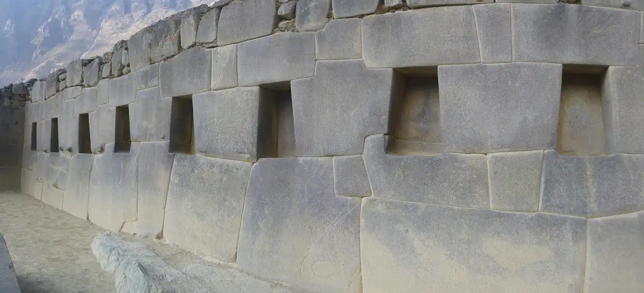 Наибольший интерес вызывает технология обработки камня и техника связки блоков в стены. На фотографиях остатков гигантских стен видны выступы различной формы — линейнообразные, пунктирные, точкообразные. Как видно из сохранившихся целых стен (к примеру, в первом ярусе террас на горе Олантайтамбо), точкообразные выступы располагаются на внешней стороне внизу каждого строительного блока. На других фотографиях можно видеть, что линейные и пунктирные выступы расположены на внутренних сторонах строительных блоков, что говорит в пользу версии о том, что эти выступы служили для прочной связки стен.