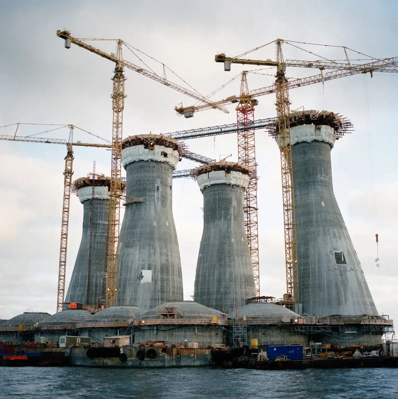 Бетононасосы на огромных подъемных кранах закачивали бетоный раствор в заранее подготовленную форму. В итоге была получена полностью монолитная структура основания без единого шва. Строительство проходило в одном из норвежских фьордов.