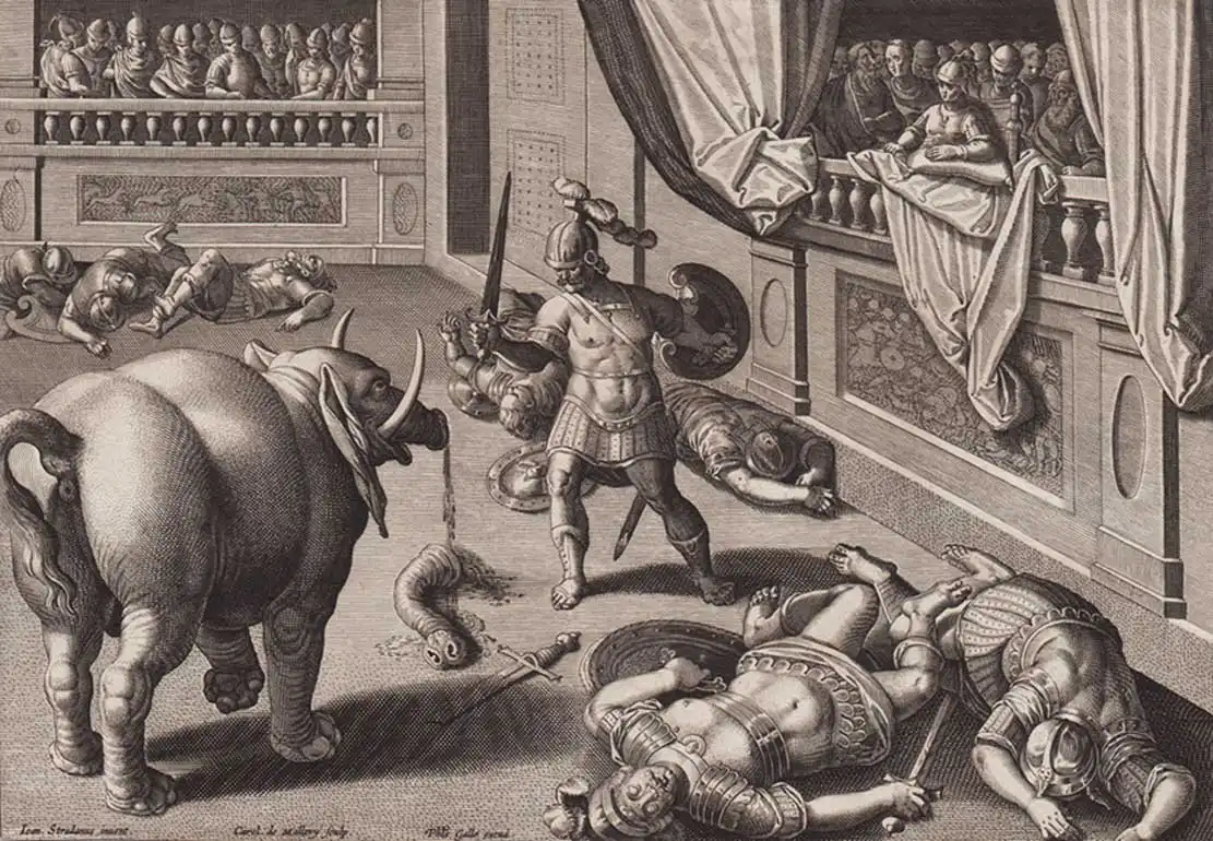 Огромной популярностью пользовалось также стравливание животных друг с другом. Римлянам надолго запомнился бой между слоном и носорогом, во время которого слон схватил метлу, которой подметали арену, ослепил ее острыми прутьями носорога, а затем растоптал противника.
