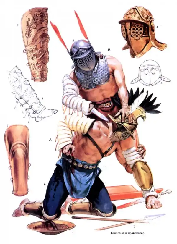 Когда новичок в должной степени постигал азы боевого искусства, его, в зависимости от способностей и физической подготовки, распределяли в специализированные группы того или иного типа гладиаторов. Самым старым, классическим типом, просуществовавшим до конца Республики, были самниты, названные так по имени народа, хоть и покоренного римлянами, но нанесшего последним несколько военных поражений, за что и были практически истреблены в I веке до н.э. И, тем не менее, именно их вооружением римляне и снабдили своих первых гладиаторов. Оно состояло из большого прямоугольного щита, шлема с высоким гребнем и султаном из перьев, короткого прямого меча и поножи на левой ноге. В начале нашей эры название «самнит» заменилось на секутора (преследователя), хотя вооружение оставалось прежним. На них очень походили гопломахи, с той разницей, что их щиты были большими и круглыми.