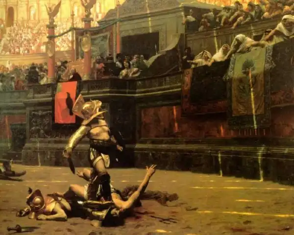 Если один из них во время поединка был тяжело ранен, он мог бросить оружие и поднять вверх руку – этим жестом он просил зрителей о пощаде. Если публике нравилось, как он сражался, то люди поднимали вверх большие пальцы рук или просто махали платками, крича при этом «Отпусти!». Если же не нравилось, то зрители опускали большие пальцы книзу, вопя «Добей!». Вердикт толпы не оспаривался даже императором.