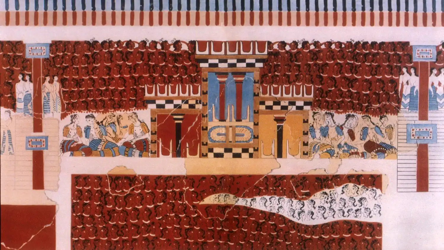 В Кносском лабиринте было довольно большое помещение со ступенчатыми трибунами, которое коллеги Эванса назвали «придворным театром увеселений». На одной из знаменитых фресок есть изображение этого «театра». Ничего праздничного там тоже усмотреть нельзя. Четырнадцать жриц на прямоугольной сцене стоят в ритуальных позах, одеты они в голубые платья. На трибунах — женщины с белыми лицами и мужчины с коричневой краской на лице, что может означать ритуал, который был в обиходе при отпевании покойников. Словом, вполне возможно, что здесь происходит отпевание, на которое собрались родственники умершего.