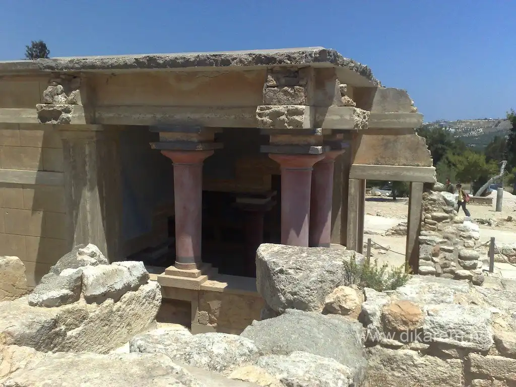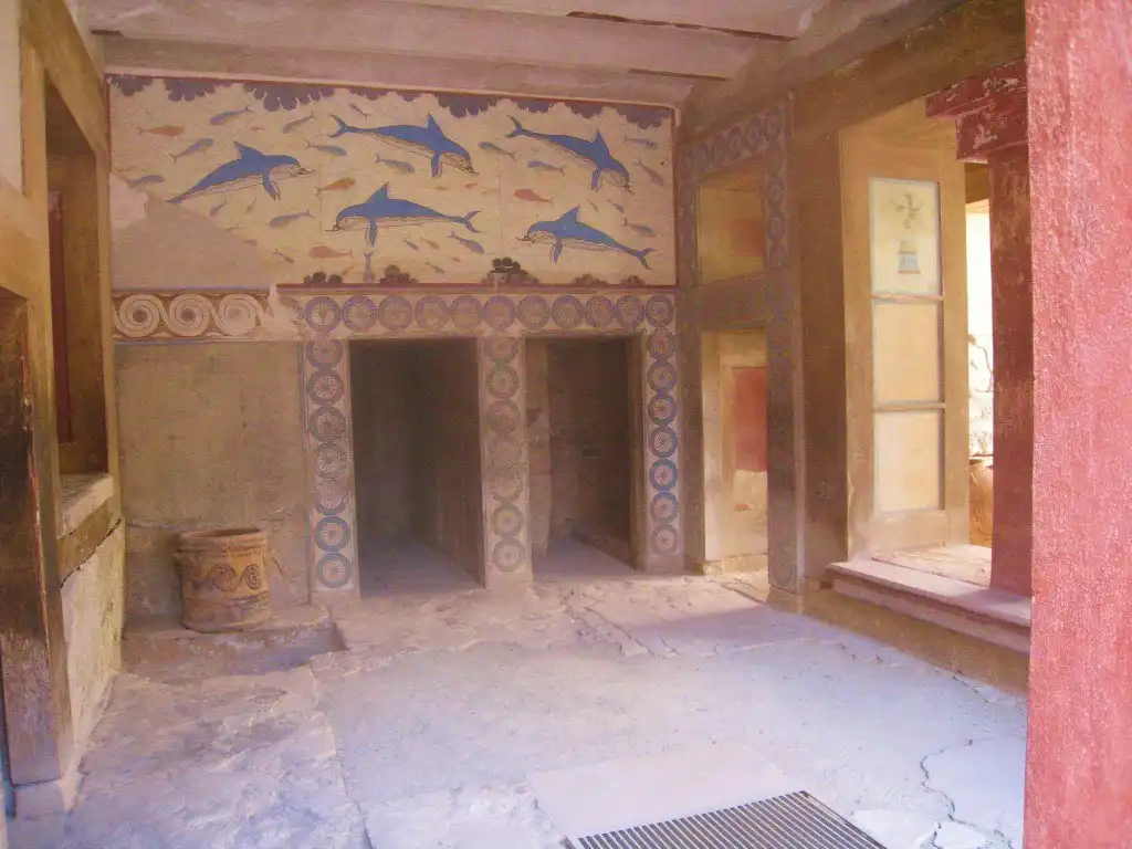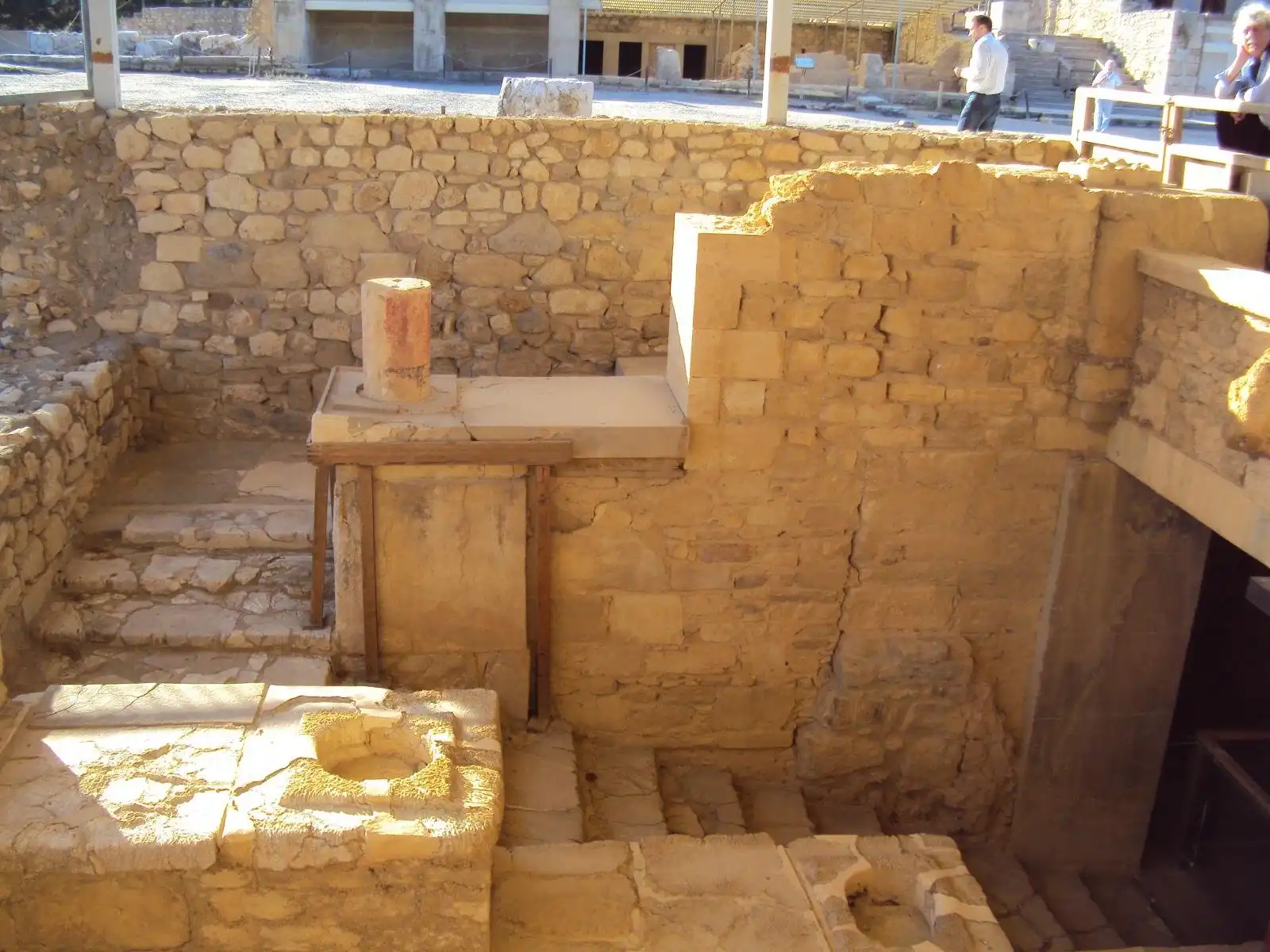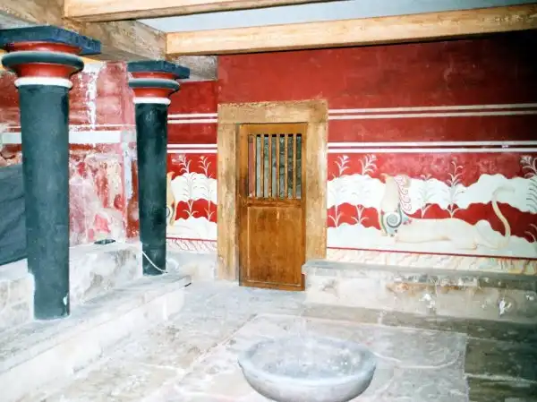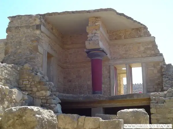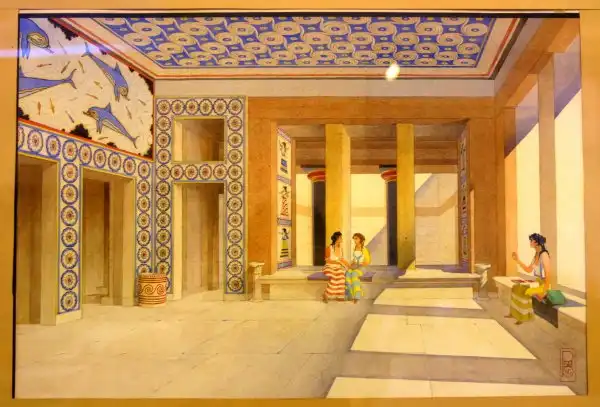 Через главный портик посетитель входил в парадный зал, затем в тронный зал и зал для выходов. По полу коридора, ведущего в эту часть дворца, проложена дорожка из плит известняка, окаймленная полосками из синего аспида. Особый ход вел прямо из покоев царя в театр, в царскую ложу, куда Минос проходил, минуя любопытные взгляды толпы. Далее следовали покои царицы, царской семьи, вельмож и приближенных государя.
