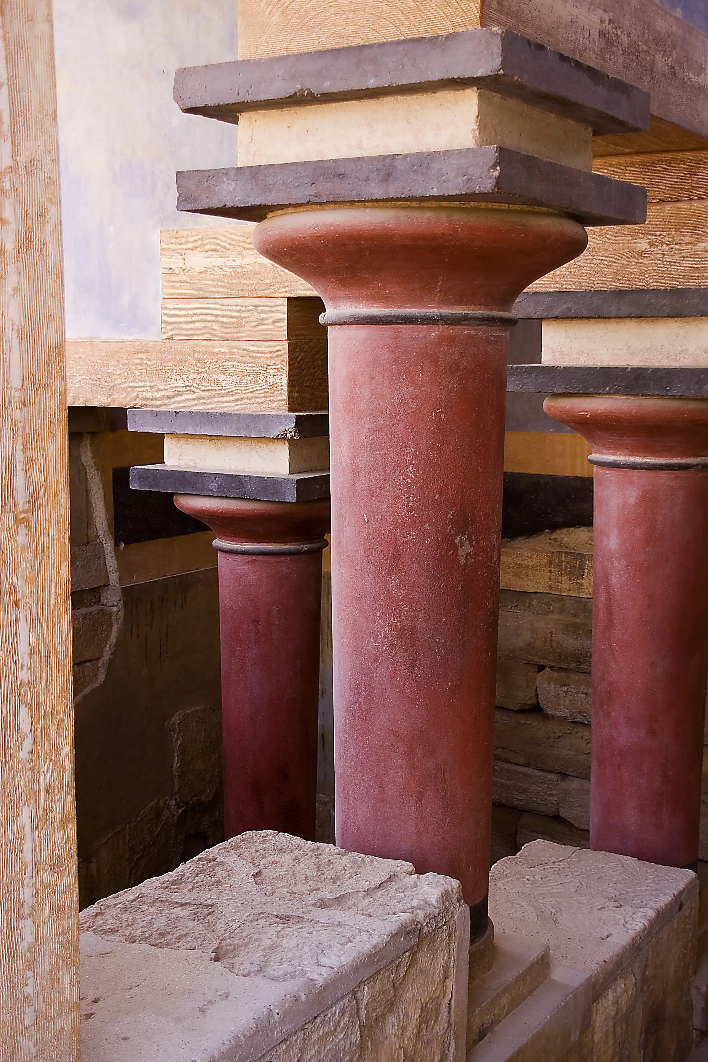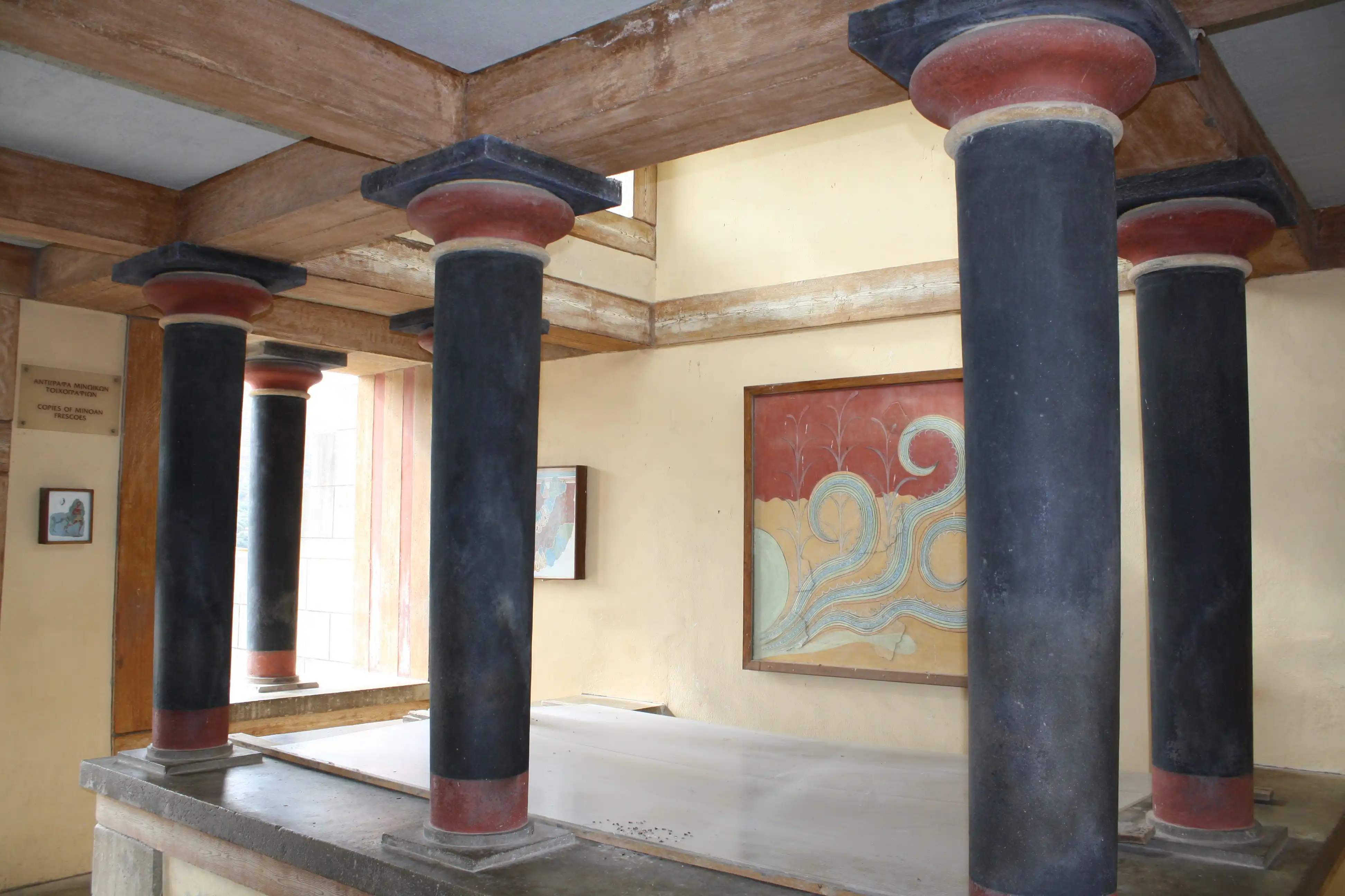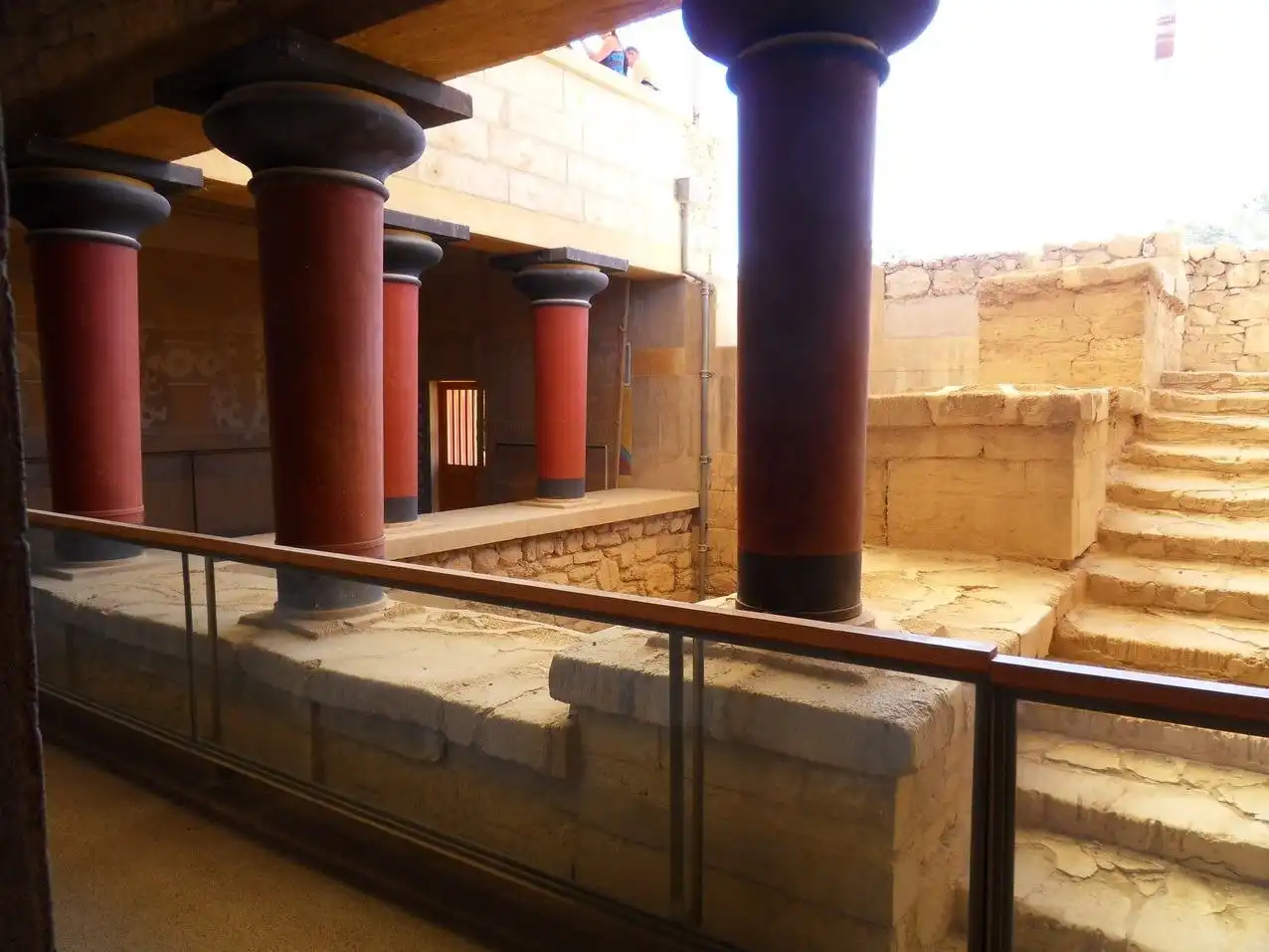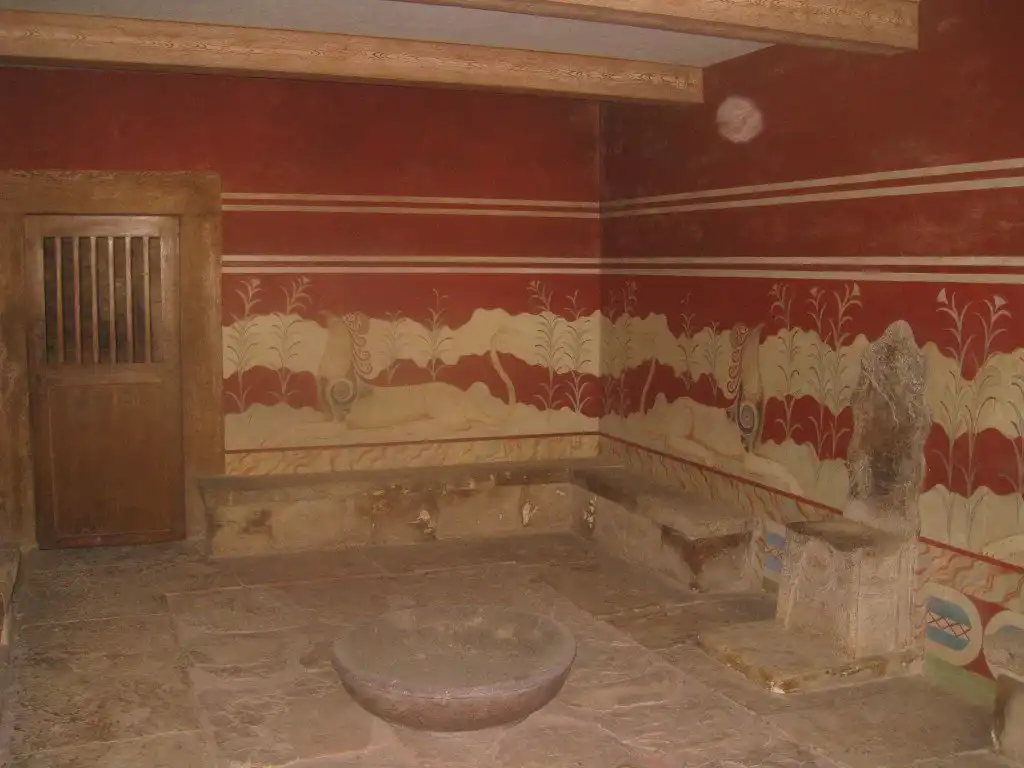 Через главный портик посетитель входил в парадный зал, затем в тронный зал и зал для выходов. По полу коридора, ведущего в эту часть дворца, проложена дорожка из плит известняка, окаймленная полосками из синего аспида. Особый ход вел прямо из покоев царя в театр, в царскую ложу, куда Минос проходил, минуя любопытные взгляды толпы. Далее следовали покои царицы, царской семьи, вельмож и приближенных государя.