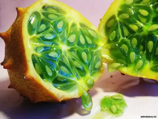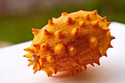 Другие названия новозеландского огурца – рогатая дыня, ангурия. Жёлто-оранжевый плод с многочисленными «рожками» прозвали дыней за приятный и освежающий вкус зелёной мякоти, в котором сочетаются нотки банана, огурца и лимона.