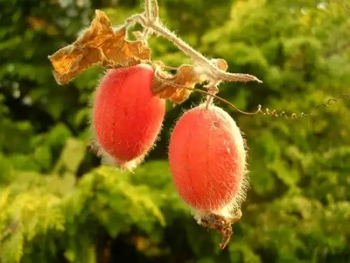 Изображение этой диковинки знакомо всем – благодаря стилизованным принтам на текстиле, в типографии и т.д. Восточную лиану семейства тыквенных ещё называют бешеной дыней или бальзамной грушей. Удлинённая ягода ярко-оранжевого цвета, покрытая пупырышками, заключает в себе красные семена, по вкусу напоминающие спелую хурму. Сама «обёртка» близка к вкусу вызревшей тыквы с горчинкой.