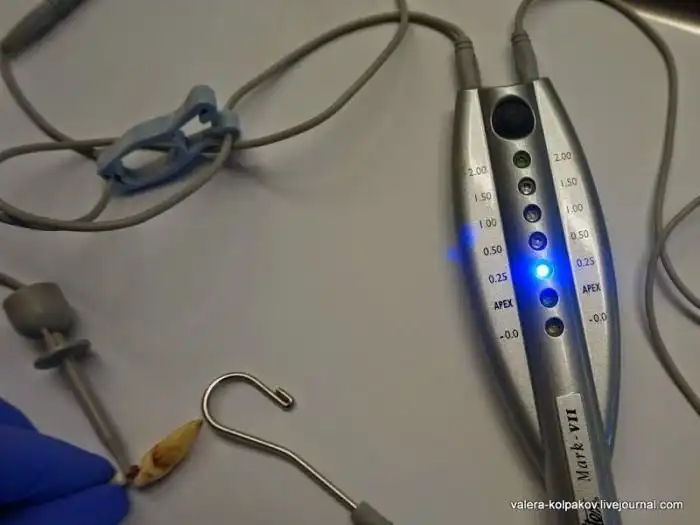 Более современные методы основаны на измерении электрического сопротивления вот, например, таким аппаратом. У аппарата два провода — справа с крючком на конце вешается на угол щеки. Левый крепится к файлу, который вводится в зуб.