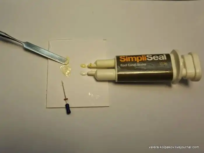 Теперь канал готов к заполнению пломбировочным материалом. Сначала его сушат бумажными иголочками. Потом поверхность канала нужно покрыть замазкой, чтоб он не протекал. Замазок также существует великое множество, на снимке одна из используемых мною. Из специального шприца выдавливаются два компонента и смешиваются. Полученная паста цепляется файлом и помещается внутрь канала.