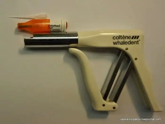Оставшееся пространство в данном случае буду заполнять холодной жидкой гуттаперчей, хотя в клинических ситуациях больше люблю горячую гуттаперчу. В этом наборе есть пистолет, капсула с материалом и пластиковый наконечник.