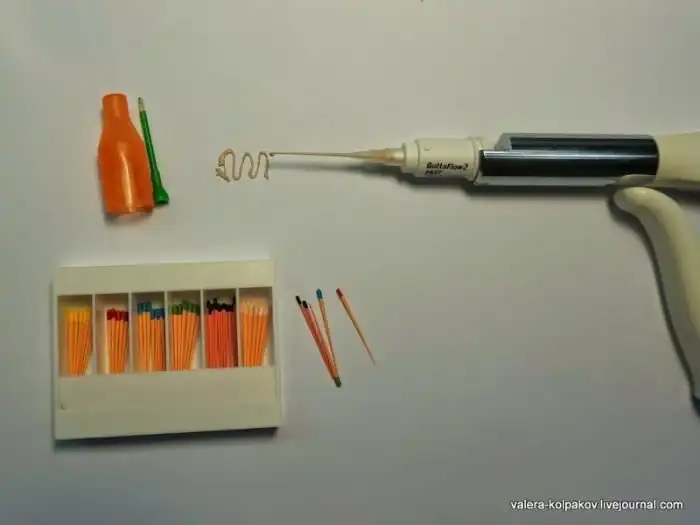 В капсуле смешиваются два компонента и из канюли поступает жидкий материал. В левом нижнем углу просто для демонстрации показаны разные конусы из гуттаперчи для других техник. Та же цветная кодировка по размерам.