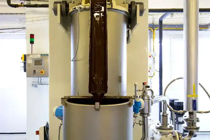 Дробилка. Чем лучше будет измельчена какао-крупка, тем более насыщенным и тонким будет вкус шоколада. Конечный размер твердых частиц какао, прошедших через измельчающее оборудование, не должен превышать 75 мкм .