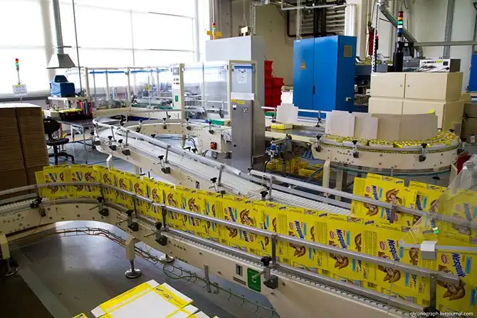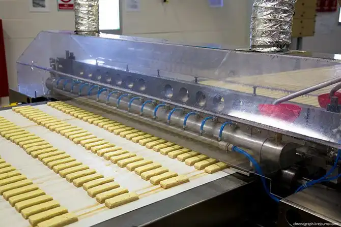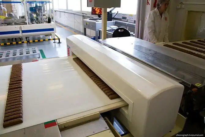 Далее батончики охлаждаются, выравниваются на транспортёрной ленте и едут в участок упаковки.