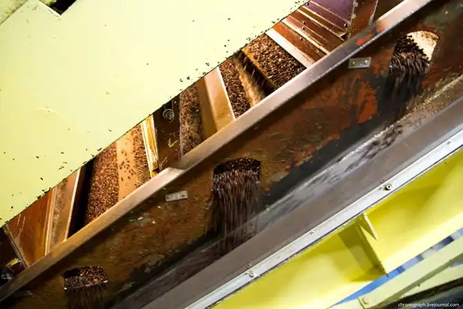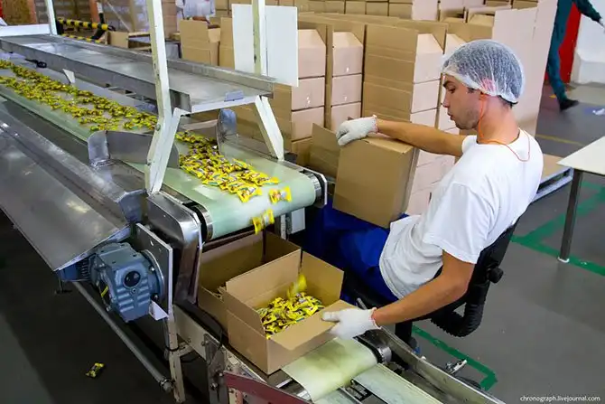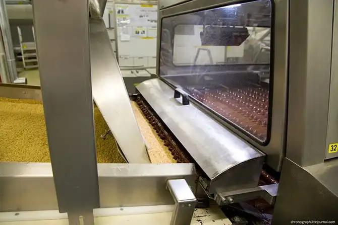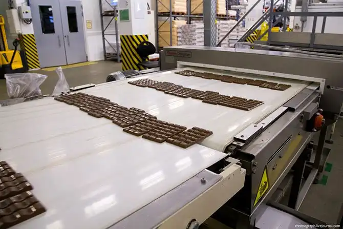 Затем формы с застывшим шоколадом переворачивают вверх дном и вытряхивают на конвейер.