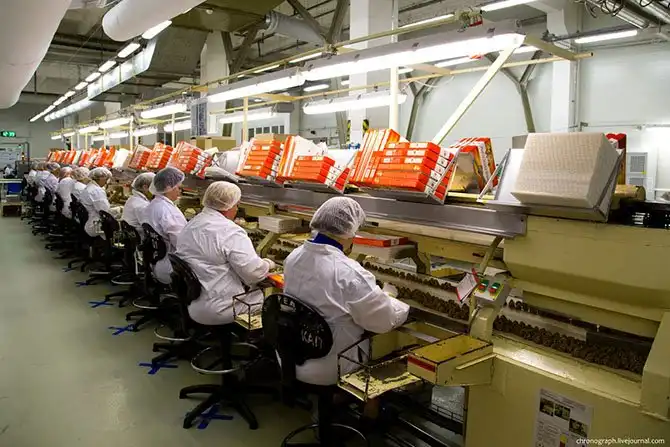 Коробки упаковываются в большие картонные коробки, маркируются и увозятся на склад.