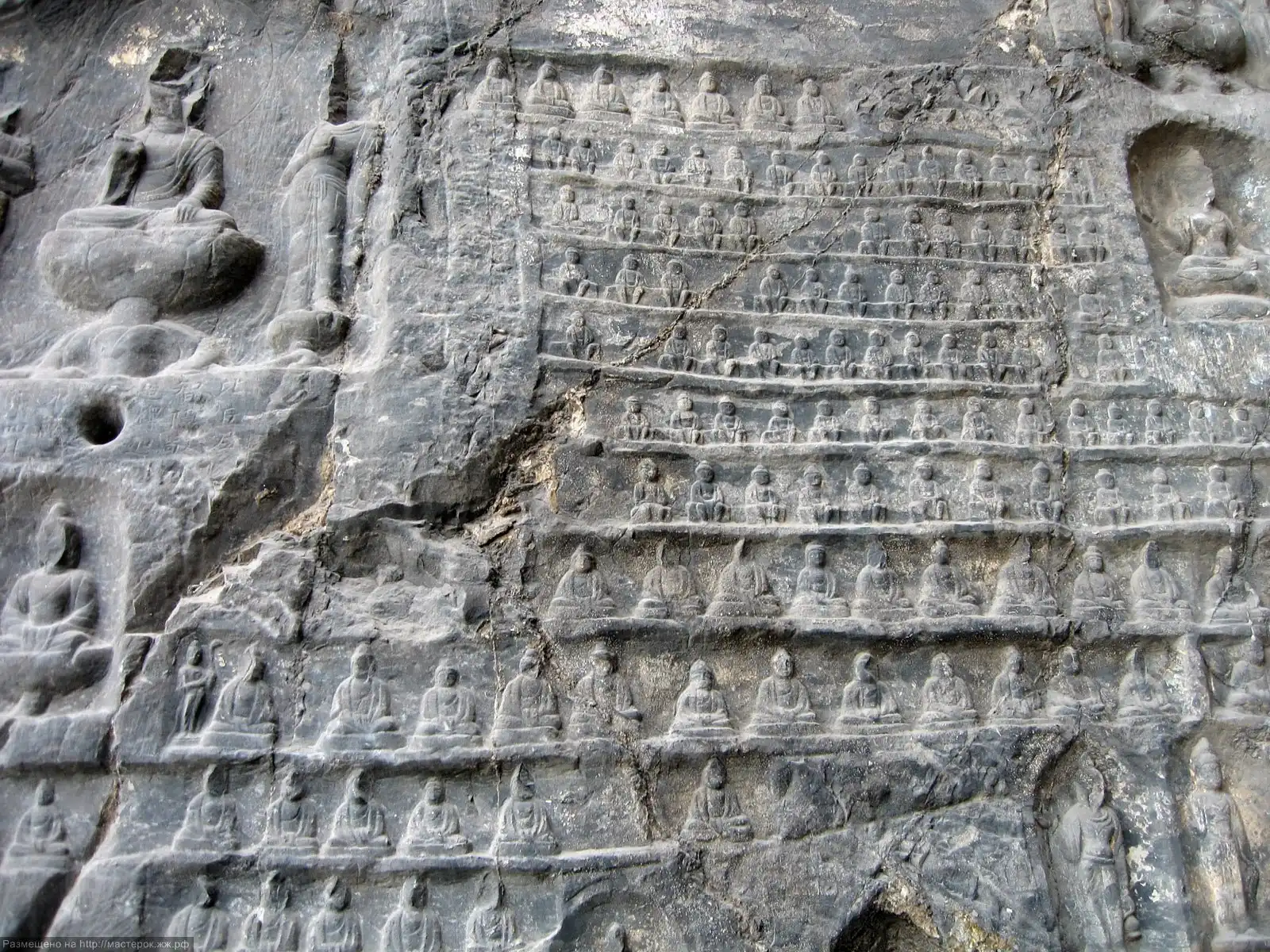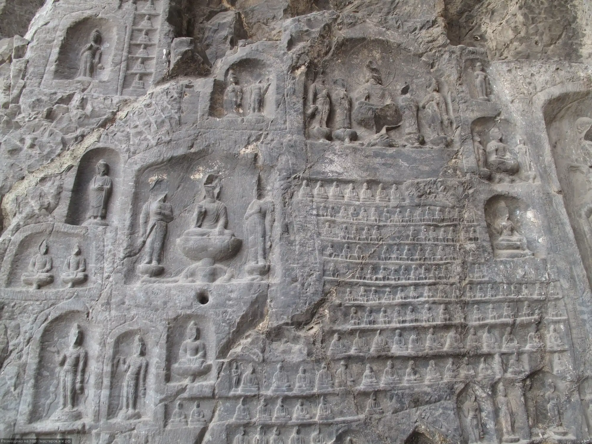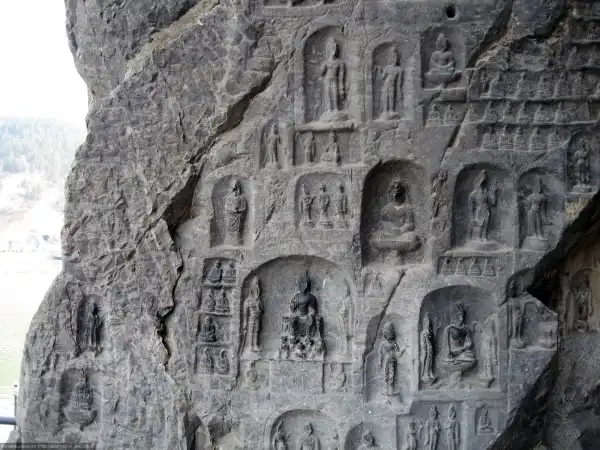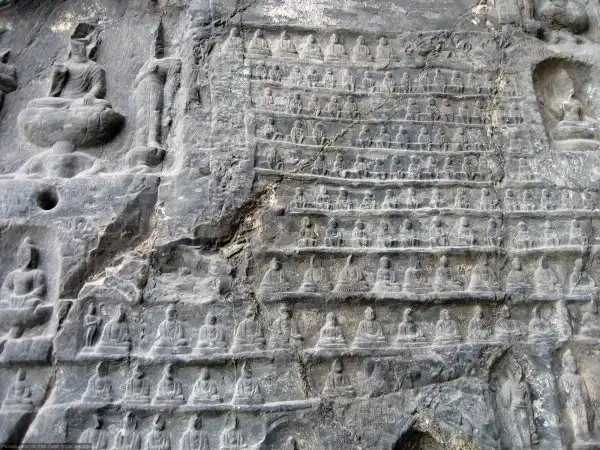 Пещера Тысячи Будд в Лунмэнь является еще один Танским шедевром. Она была построена в 680 г. н.э. в часть императора Гао Цзуна и императрицы У. В северной и южной стенах пещеры вырезаны более 15 000 маленьких изображений Будды. Центральный Будда с полным и спокойным лицом, сидит на троне из лотоса с перекрещенными ногами, трон поддерживают здоровые и сильные ваджры. За Буддой расположены 54 лотоса с восседающими на них Бодхисаттвами. Северная и южная часть покрыты 15 тыс. миниатюрными изображениями Будды. Под ними 12 апсар, каждая из которых танцует или играет на музыкальном инструменте. Пещера защищена металлическим забором, поэтому на миниатюрные изображения рекомендуется смотреть в бинокль.