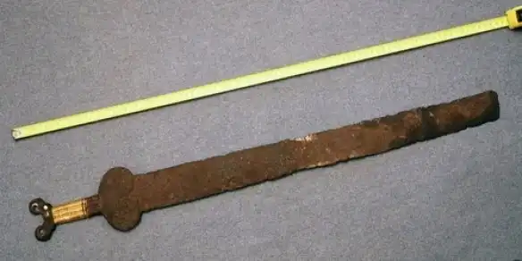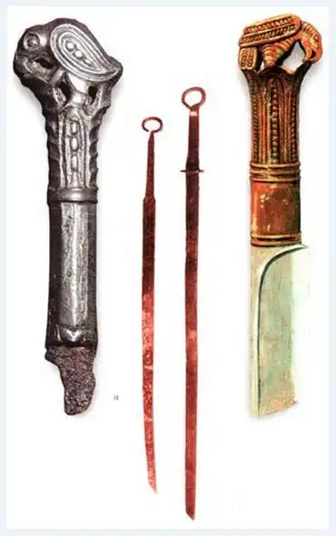 Археологи определили, что это холодное оружие было выковано или в VI, или в начале V века до нашей эры. На его принадлежность к скифской культуре указывают изображения грифонов, сохранившихся на рукояти, инкрустированной золотом. Грифоны, это Гиперборейская символика, которую сохранили арийские народы.