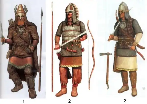1)Кулайский таежный вождь; 2) Воин VI-IX вв. Томского Приобья; 3) Воин Усть-Ишимской культуры таёжного Прииртышья VIII-XII вв. (Рядовой таежный воин эпохи викингов). Реконструкция по материалам памятников Омского Прииртышья и Нижнего Приобья.