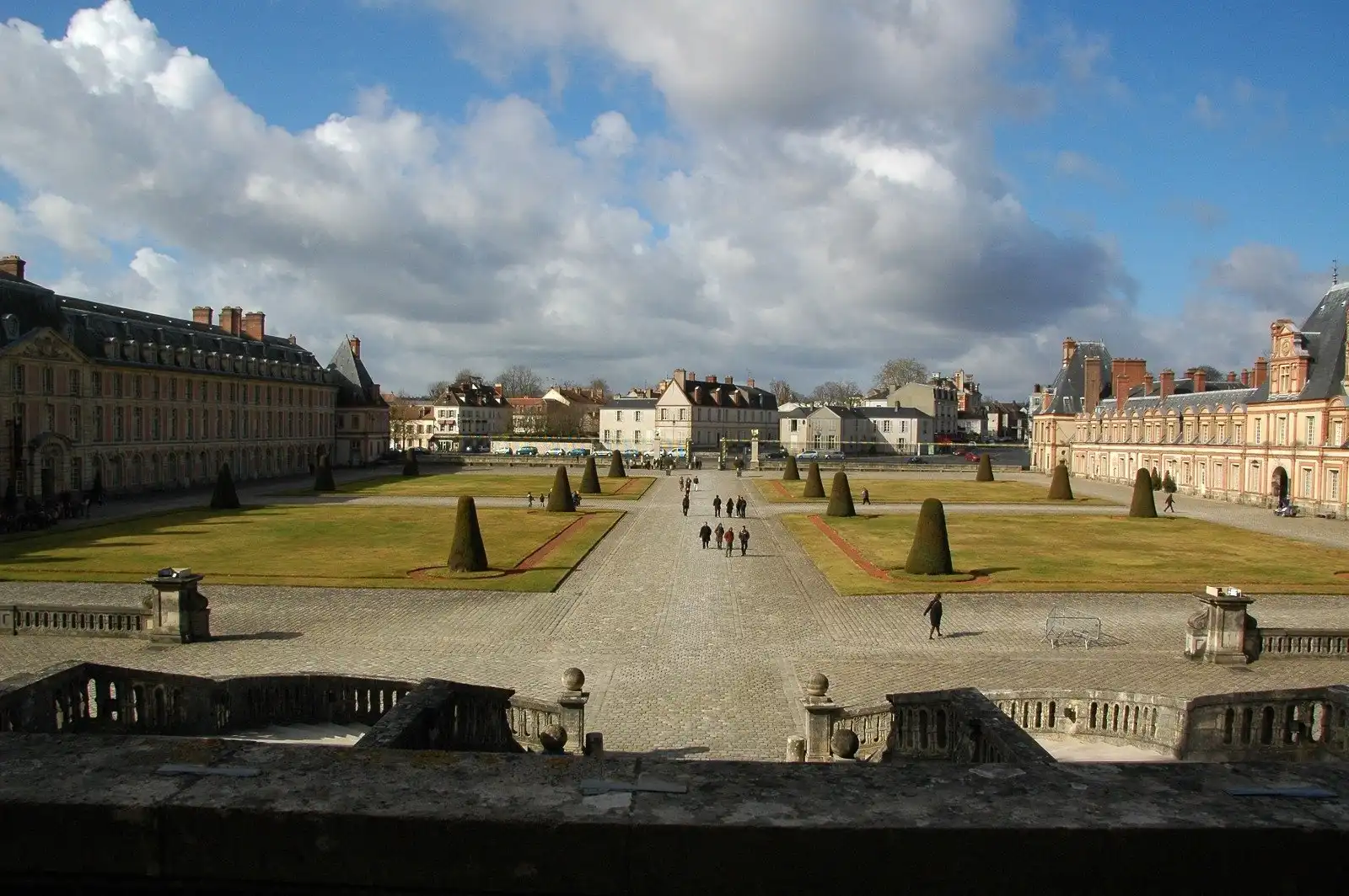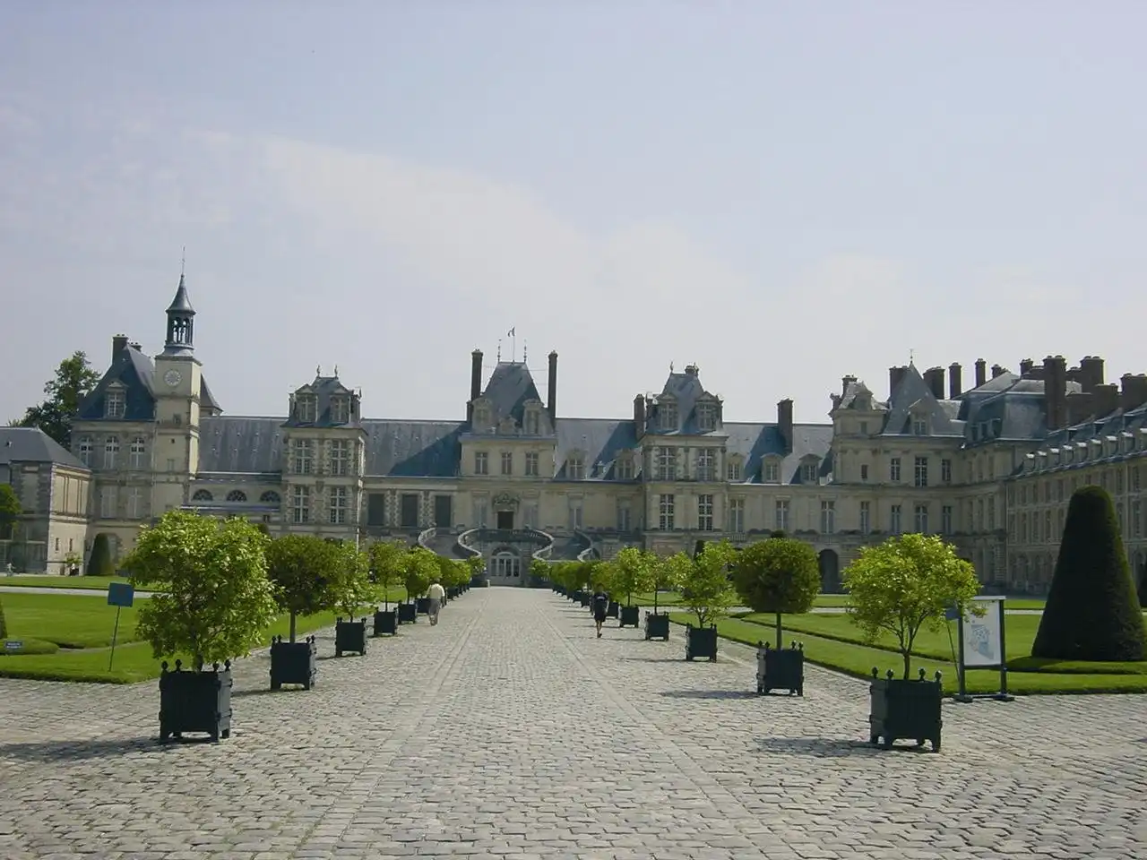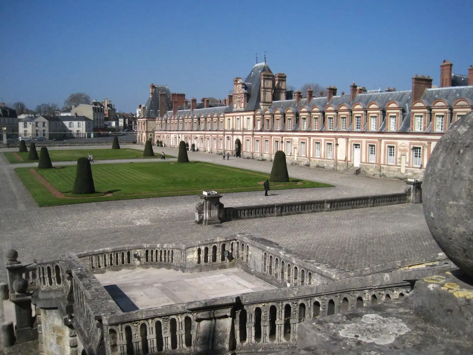 Знакомство с ансамблем Фонтенбло начинается с Почетного двора, который просторно раскинулся перед главным дворцовым фасадом. Двор и есть часть того участка, на котором некогда бил чудесный источник. Почти всю площадь Почетного двора (152х112 метров) занимает зеленый партер: четыре больших квадрата стриженой травы легли здесь по два с каждой стороны центральной аллеи, ведущей к парадному входу во дворец.