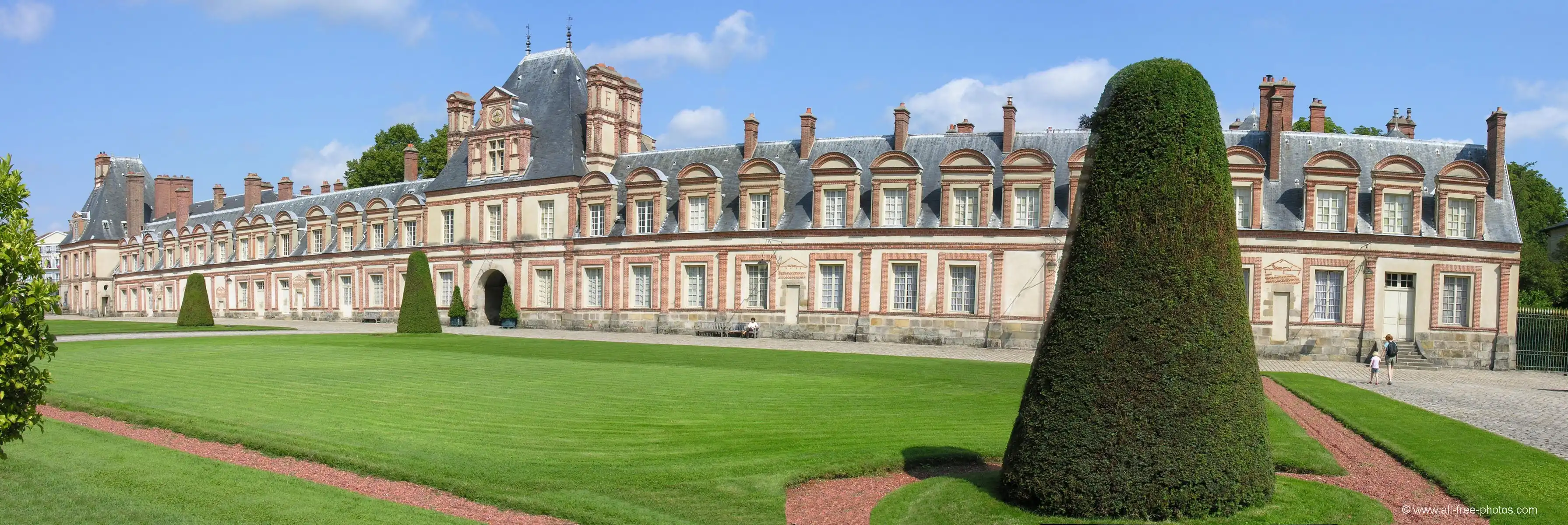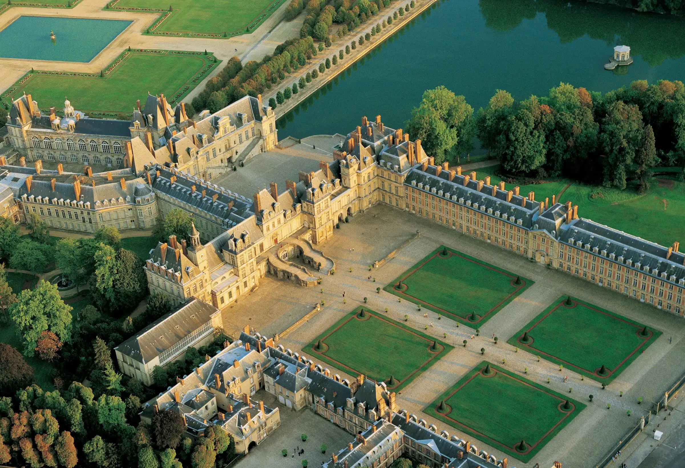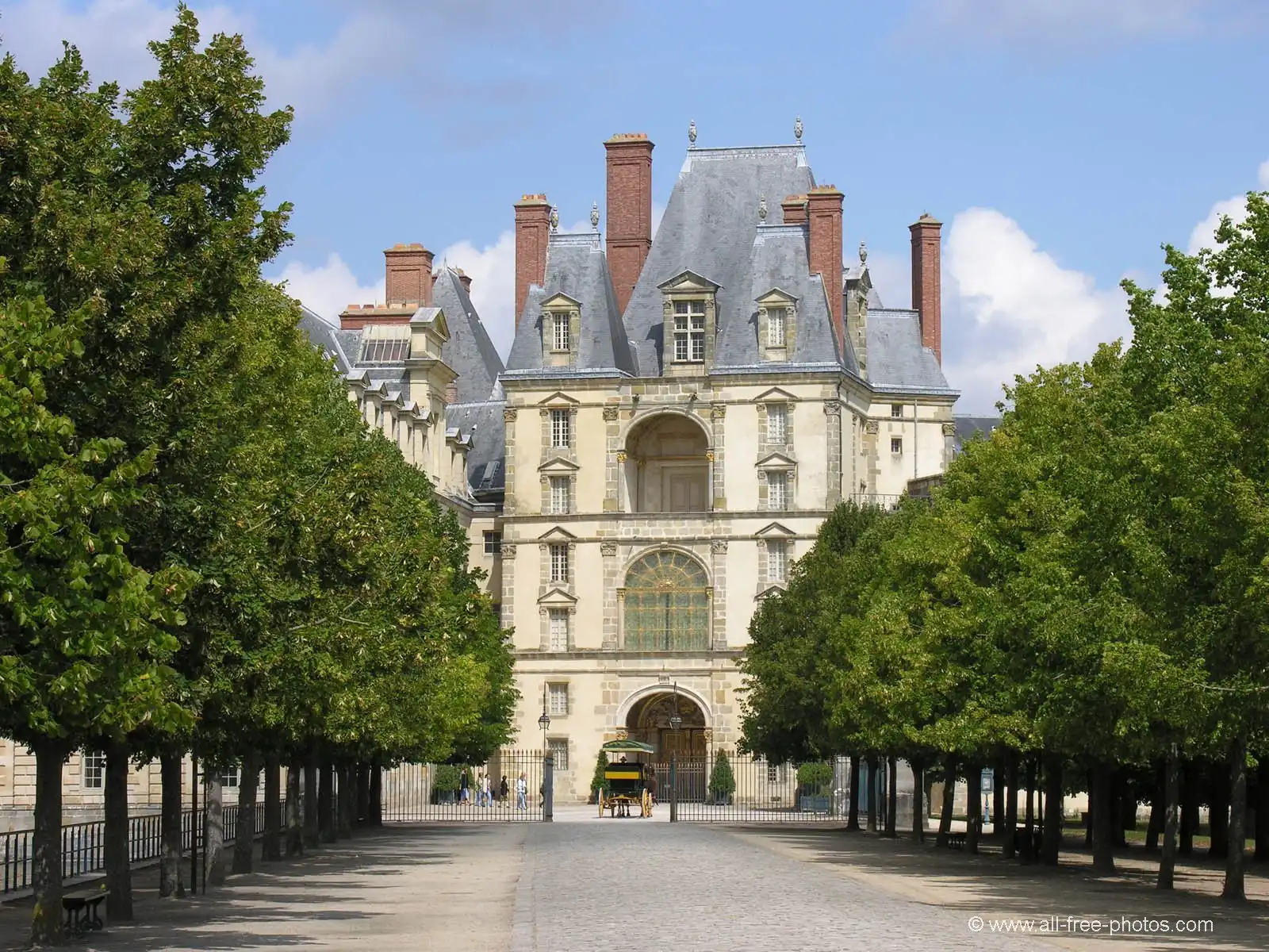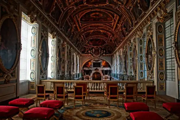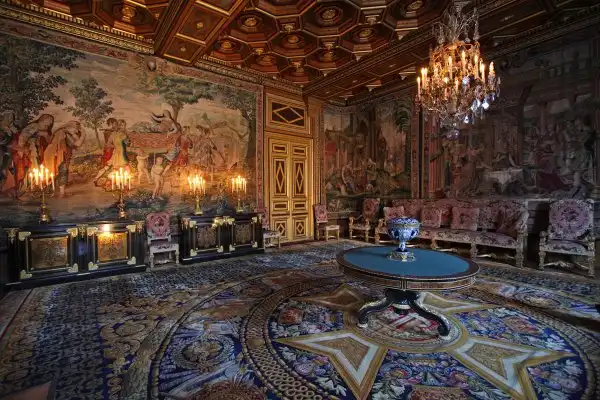 Многим здесь интереснее, чем в Версале, потому как древнее: французские короли жили в городке Фонтенбло с 1137 по 1870 год. Роскошный дворец, которому когда-то Наполеон дал название «Дом веков», появился лишь в XVI веке. До этого в лес к югу от Парижа французские короли приезжали на охоту. По воле Франциска I, пригласившего для обустройства дворца итальянских художников, превративших обычный загородный особняк в своего рода художественный музей, дворец стал очагом распространения итальянской ренессансной культуры: здесь работали основатели «школы Фонтенбло в живописи». Интерьер замка: на 2-ом этаже – большие королевские покои, богато украшенные и меблированные, часовня, галерея Франциска I с фресками, чудесная бальная зала (30 м в длину и 10 м в ширину) с уникальными росписями, огромный камин, поддерживаемый двумя атлантами, двойные витые лестницы, каменное «кружево», кессонные потолки, королевские спальни, обитые лионским шелком, зал Совета, Тронный зал и внутренние покои императора.