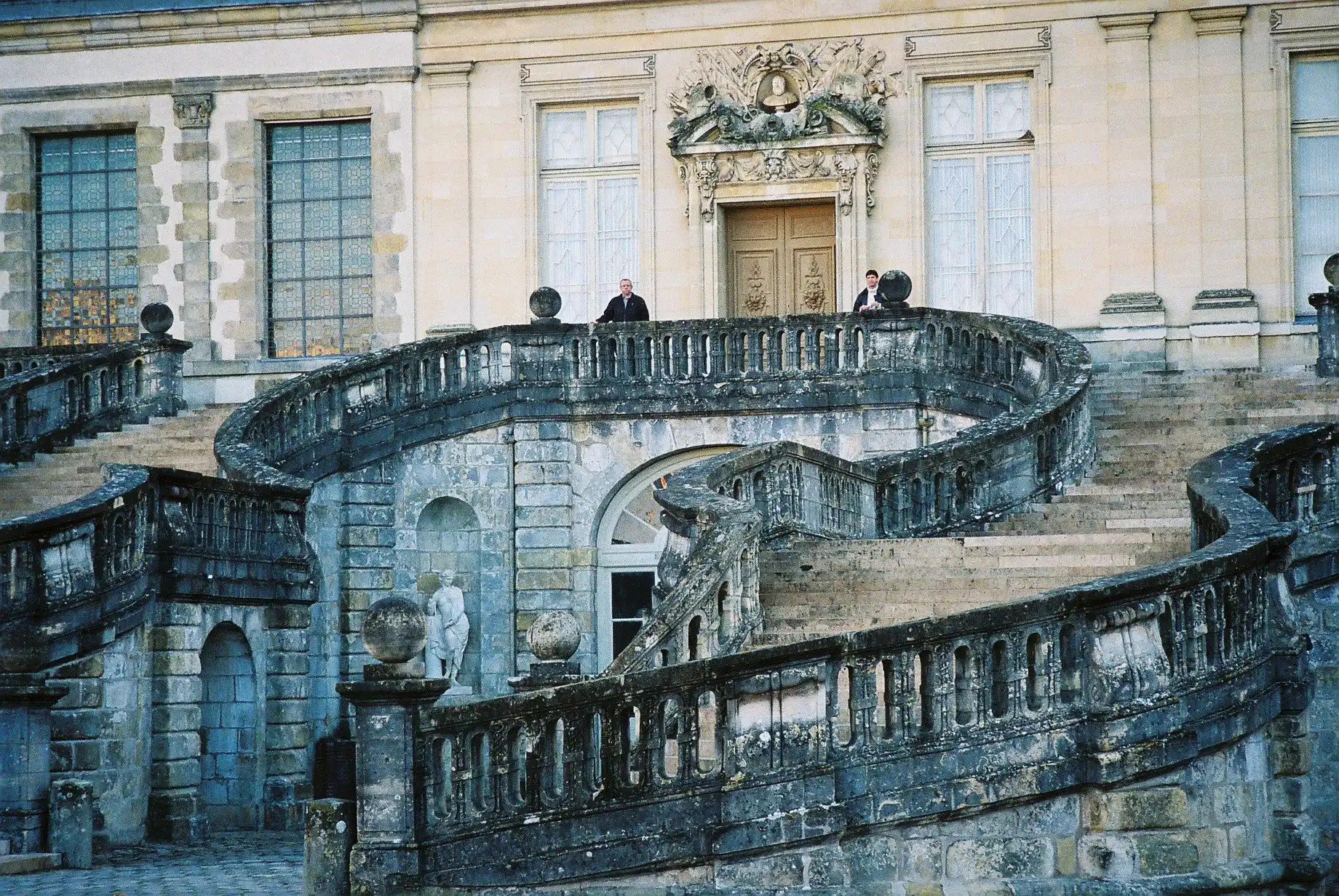 Ступени лестницы, специально для всадников сделаны, пологими. Лестничные марши округлены и напоминают две подковы, соединенные между собой. Массивная каменная балюстрада прилегает к этим своеобразным лестничным маршам. Балюстраду возвели в 1634 году, воспользовавшись проектом архитектора Серсо. Посреди фонтанного двора красиво смотрится неповторимый фонтан с установленной статуей Уиллиса. Фонтан украшен фигурой Уиллиса с 1812 года. Из фонтанного двора попадаем в известную галерею, выстроенную в годы правления короля Франциска I . Эту галерею можно смело считать первой из художественных галерей, имеющихся сегодня в королевских дворцах Лувр и Версаль. Всего в нескольких десятках метров от этого фонтанного двора находится колоритный сад Дианы.