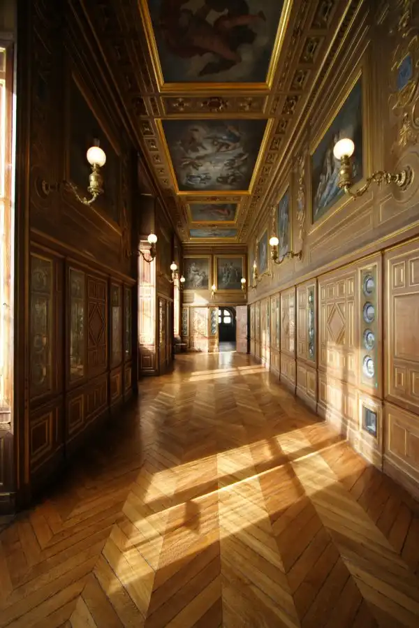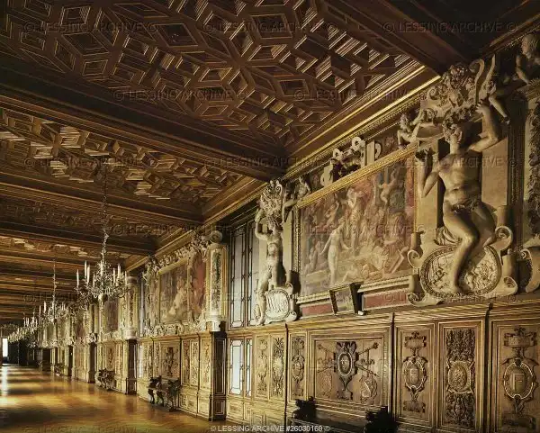 Во дворце Фонтенбло расположился один из самых значительных памятников французского Возрождения - Галерея Франциска I. Она представляет собой очень длинное и довольно узкое помещение (64х6 метров), перекрытое коробовым сводом. Стены Галереи расчленены на два яруса: нижний обшит деревянными резными панелями, по которым идут изображения герба Франции и монограммы короля, заключенные в овалы. Верхний ярус Галереи украшен фресками и скульптурными рельефами. Высокие окна, уходя в стены, образуют неглубокие ниши: льющиеся сквозь них потоки света озаряют живопись с ее оригинальной оправой и скользят по золотистой поверхности дубовых паркетов.