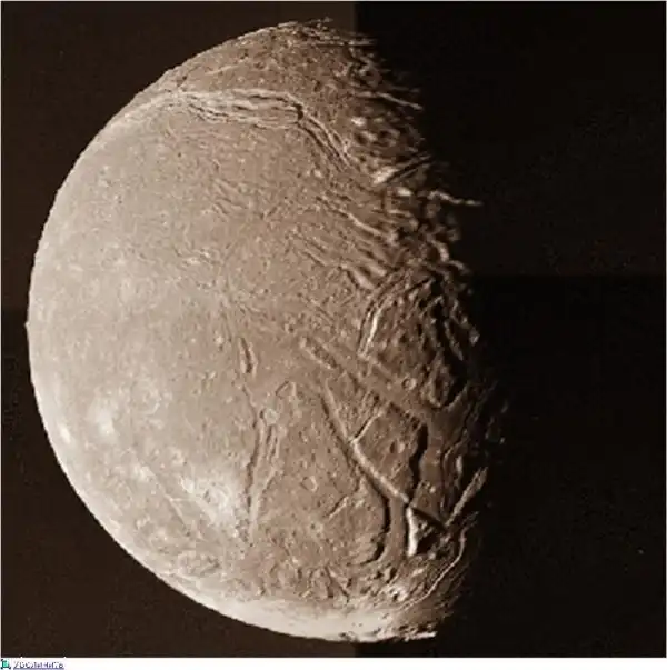 Как на поверхности Ариэля образовались ущелья? Была развита теория, в которой из-за нагрева, вызванного приливным влиянием Урана, происходили «землетрясения» и значительные смещения частей поверхности спутника. Теперь на замерзшем Ариэле видна густая сеть желобов, многие из которых внутри покрыты неизвестным веществом. Ариэль — второй по расстоянию от Урана спутник после Миранды. Он состоит наполовину из водяного льда и наполовину из камня. Ариэль был открыт Вилльямом Ласселом в 1851 году.