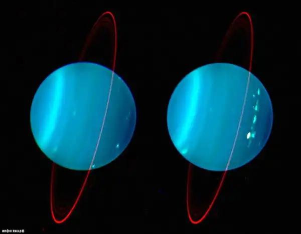 Этот пристальный взгляд, брошенный на наклонный газовый гигант Уран, показал драматические детали атмосферы планеты и системы ее колец. Это замечательное наземное изображение было сделано с использованием камеры близкого инфракрасного диапазона и системы адаптивной оптики телескопа Кек для уменьшения размытия, вызываемого земной атмосферой. Съемка, сделанная в июле 2004 года , показывает нам обе стороны Урана . На обоих снимках высокие (белые) облачные структуры в основном сосредоточены в северном (правом от нас) полушарии. Облака промежуточной высоты показаны зеленым цветом, а низкие — синим. На фоне этой сине-голубой искусственной раскраски красные оттенки четко выделяют слабые кольца. Из-за очень большого наклона оси вращения сезонные изменения на Уране очень сильные. Осень в южном полушарии Урана наступила в 2007 году.