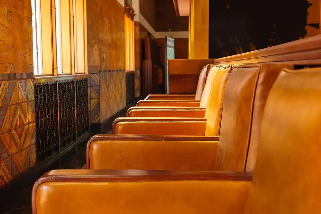 В работе над проектом этого здания отец и сын, Джон и Дональд Паркинсоны, использовали смешение испанского колониального стиля и современного на тот момент стиля ар-деко. Высокий белый колониальный потолок вокзала напоминает старую Калифорнию, в то время как его главный зал ожидания роскошно декорирован окрашенной древесиной по стенам и разноцветными мраморными вставками на полу.