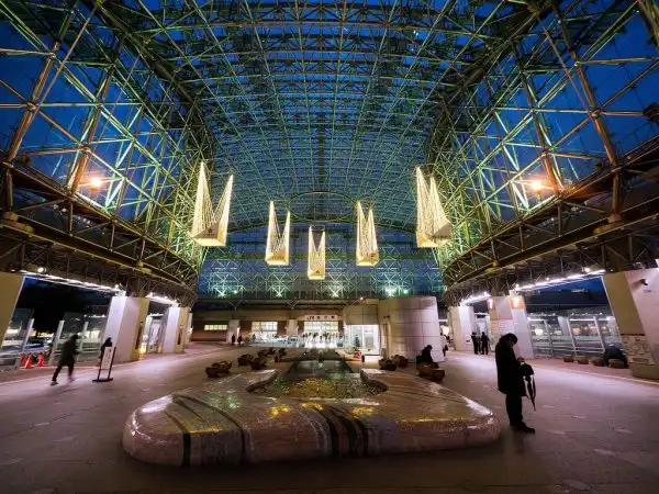 Полюбовавшись центральным футуристическим входом, обогните вокзал и пройдите до его конца, где вы найдете фонтан, который к тому же еще и показывает время. Это Япония.