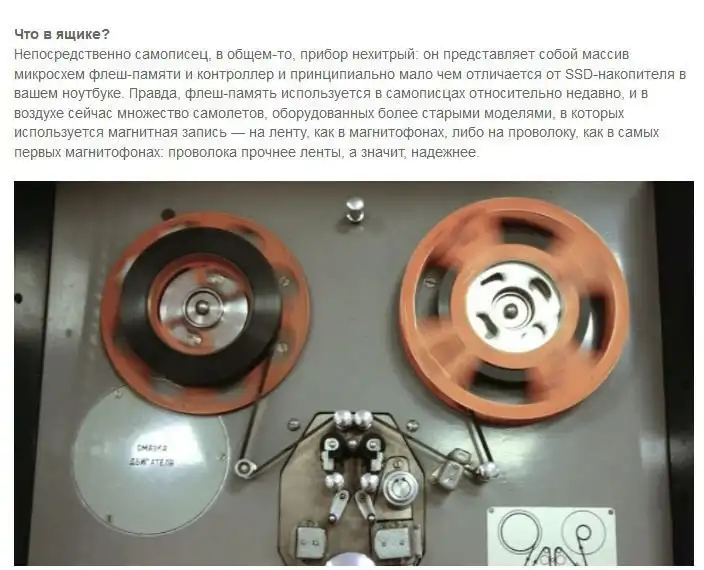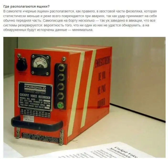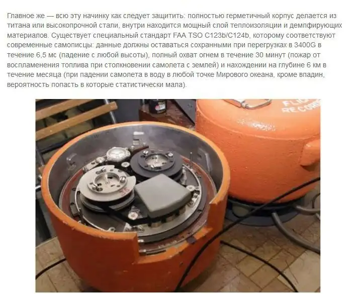 Устройство, которое обычно в народе называют "черным ящиком", и которое фиксирует все происходившие события на борту каждого самолета, на самом деле - оранжевого или красного цвета. Называется оно - бортовой самописец и имеет шарообразную или цилиндрическую форму, что повышает его прочность и противостоит внешним воздействиям, неизбежным при падении самолета.