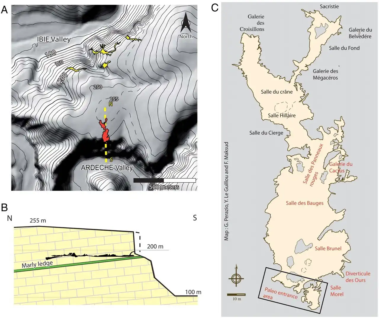 Пещера находится на юге Франции, в обрывистом берегу каньона реки Ардеж, притока Роны, в очень живописном месте, в окрестностях Понт д’Арк («Арочного моста»). Этот природный мост образован в скале огромной промоиной высотой до 60 метров.