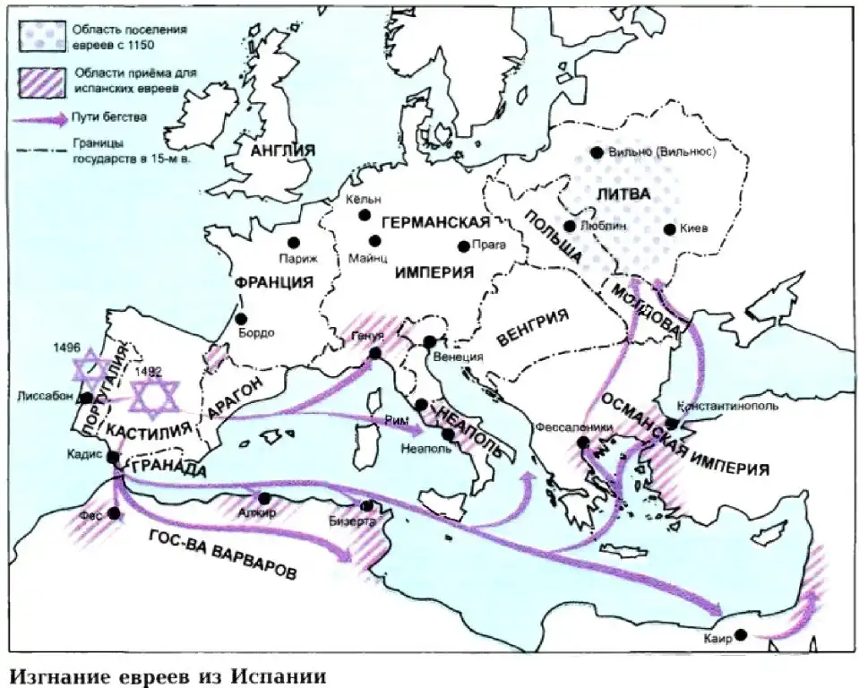 Изгнать евреев было давней мечтой испанской инквизиции, возглавляемой Фомой Торквемадой. Он верил, что, пока евреи остаются в Испании, они будут влиять на десятки тысяч обращенных в христианство соплеменников, побуждая тех честно исповедовать иудаизм. Фердинанд и Изабелла отвергали требование Торквемады об изгнании евреев вплоть до января 1492 г., когда испанская армия разбила мусульманские войска в Гранаде, вернув тем самым под власть христиан всю Испанию.
