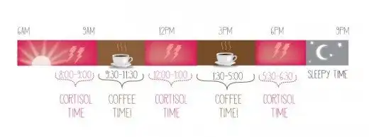 Ваше тело по утрам естественно производит гормон кортизол, который поможет вам чувствовать себя бодрым и свежим. Это обусловлено особенностями человеческого организма, так называемыми циркадными суточными ритмами. Так что если у вас есть привычка пить кофе по утрам, чтобы проснуться, то это совершенно не имеет смысла. Гораздо лучше подождать, когда уровень кортизола снизится, а это наступит после 9–10 часов утра, и уже тогда выпить чашку кофе.