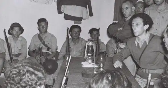 Абба Ковнер (стоит в центре) среди подпольщиков гетто 14 июля 1944