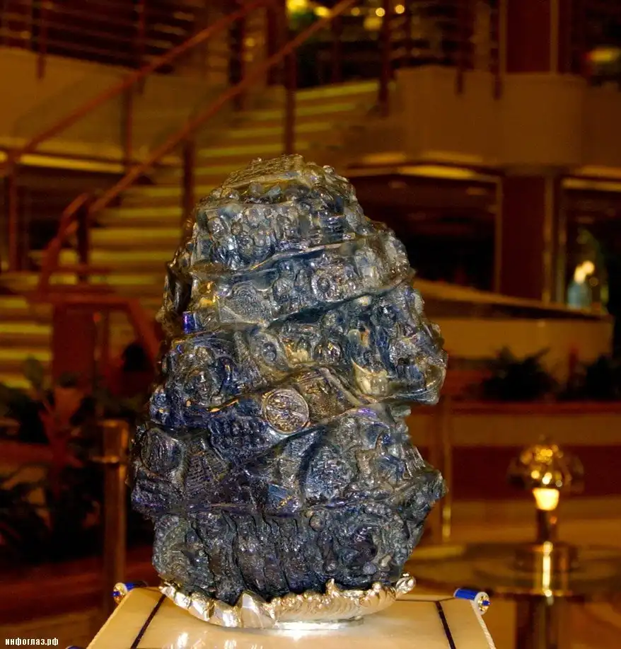 «Сапфир Тысячелетия» размером с футбольный мяч – это драгоценный камень с вырезанными на нём знаменитыми историческими фигурами. Сапфир продаётся, если кто-то решится потратить на него 180 миллионов долларов и пообещает, что это чудо размером в 61 500 карат будет размещено в открытом для посещения публики месте.